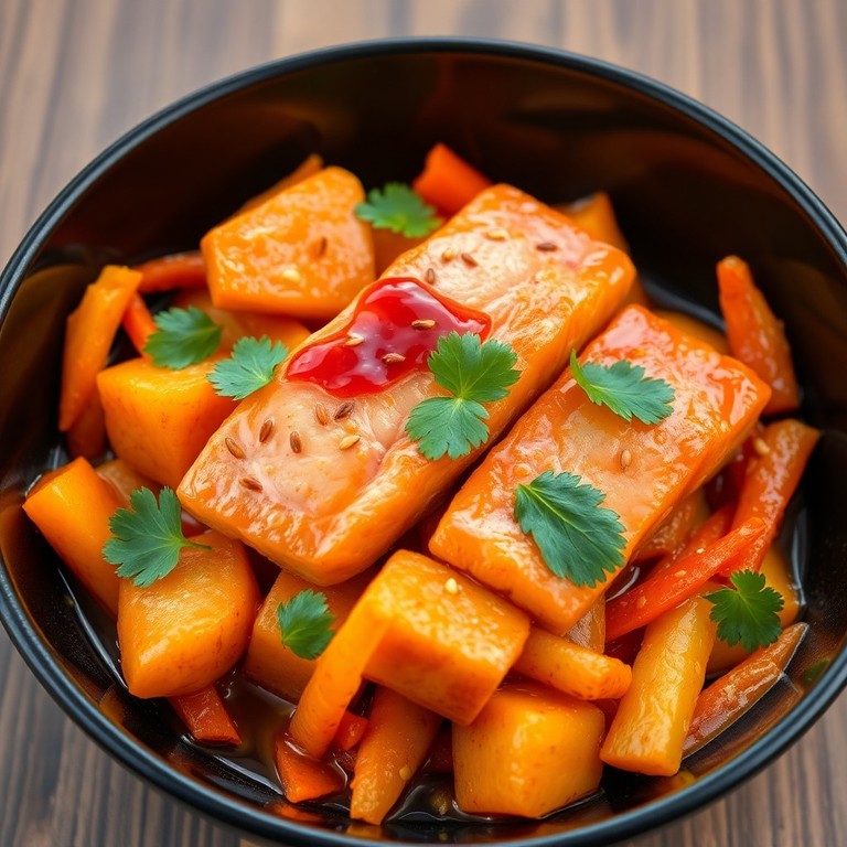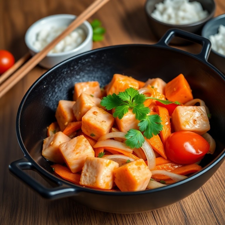 Salteado Asiático de Salmón, Zanahoria y Patata