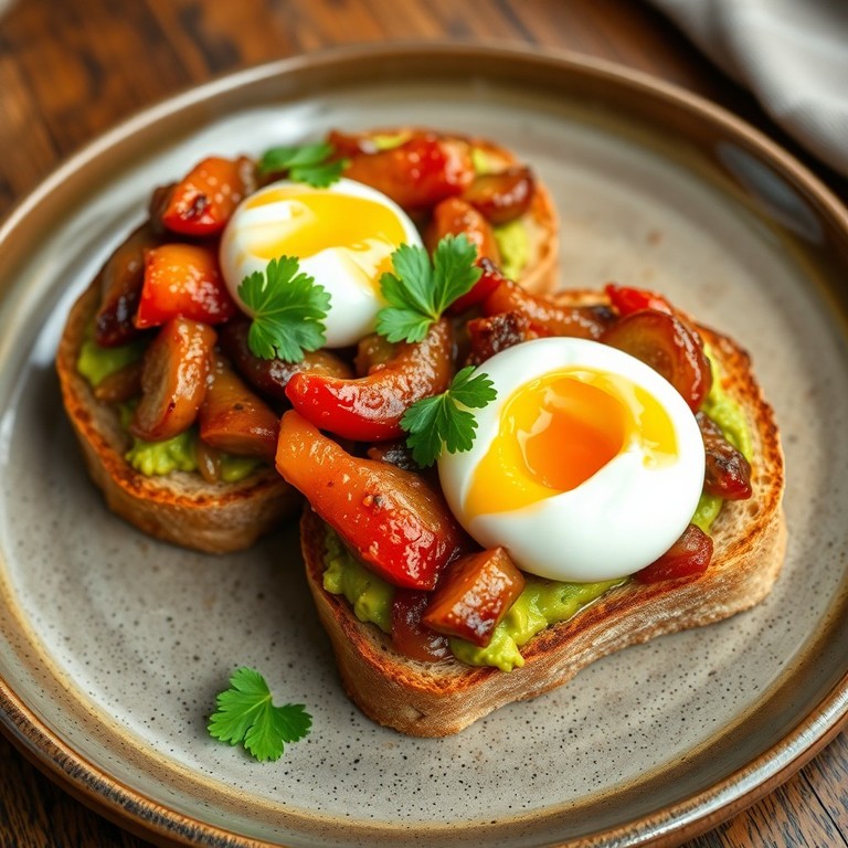 Tostadas de aguacate con huevo poché y cerdo a la parrilla