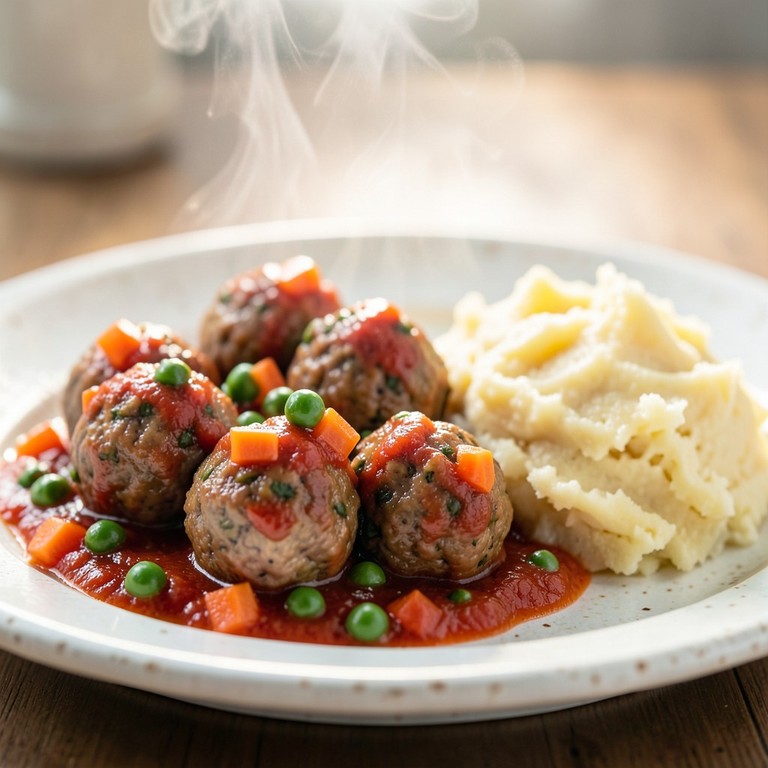 Albóndigas de Cerdo en Salsa de Tomate con Puré de Plátano