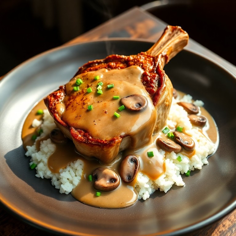 - Pan-Seared Veal Chop with Creamy Mushroom Sauce and Fluffy White Rice