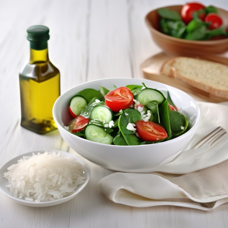 Uma salada refrescante com espinafre fresco e ingredientes saud\u00e1veis.