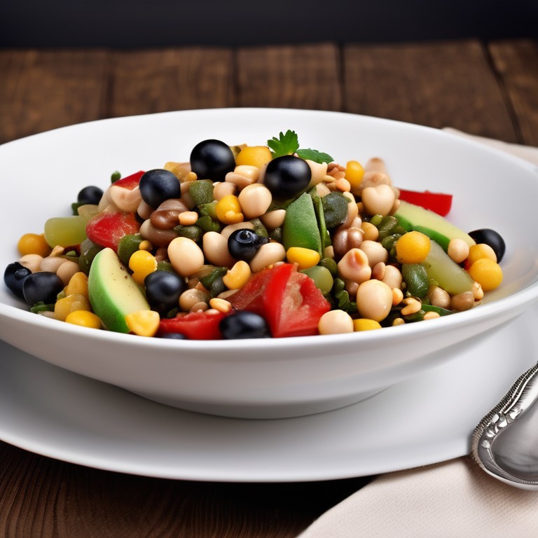 Una ensalada saludable y colorida con garbanzos, porotos rojos, porotos negros, porotos aduki, variedad de frutos secos, cereales, carnes, y vegetales frescos. Rica en sabor y nutrientes esenciales.