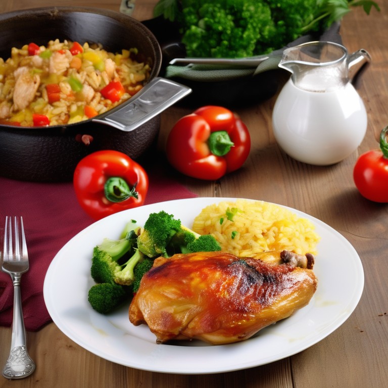 Disfruta de un almuerzo delicioso con esta receta de pollo asado con verduras frescas y arroz al azafrán.