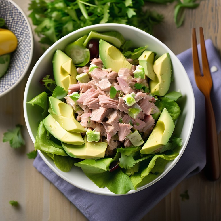 Una deliciosa ensalada fresca con atún y aguacate que es perfecta para una comida ligera o como guarnición.