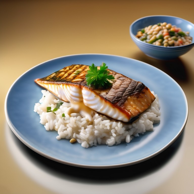 Ein köstliches und gesundes Gericht mit gegrilltem Fisch, cremigem Käse und einer erfrischenden Joghurtsoße auf einem Bett aus würzigem Bohnen-Linsen-Reis.