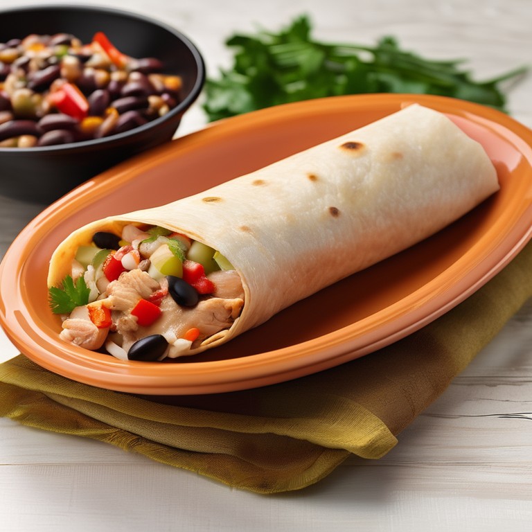 Delicioso burrito de pollo con una mezcla sabrosa de pollo, frijoles, arroz y verduras envuelto en una tortilla suave. Perfecto para una comida rápida y reconfortante.