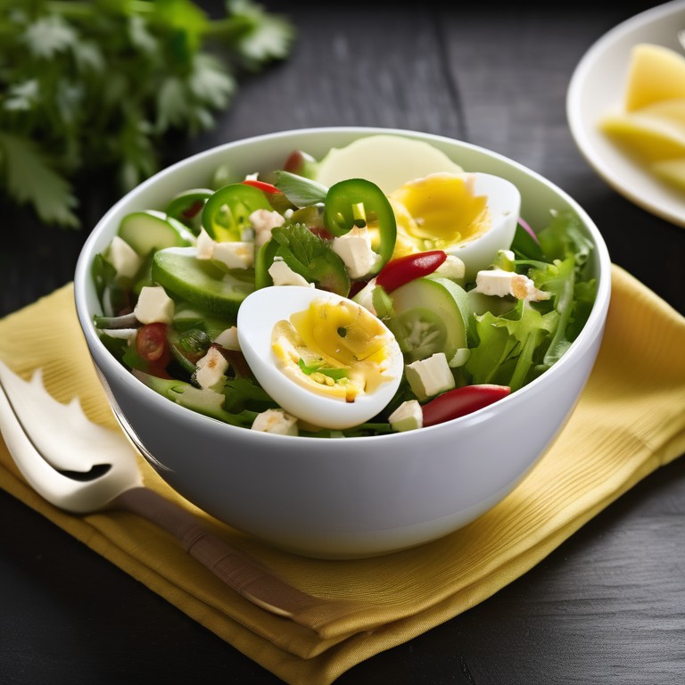 Una deliciosa ensalada fresca con huevo, queso, chile jalapeño y limón, perfecta para una comida ligera y sabrosa.