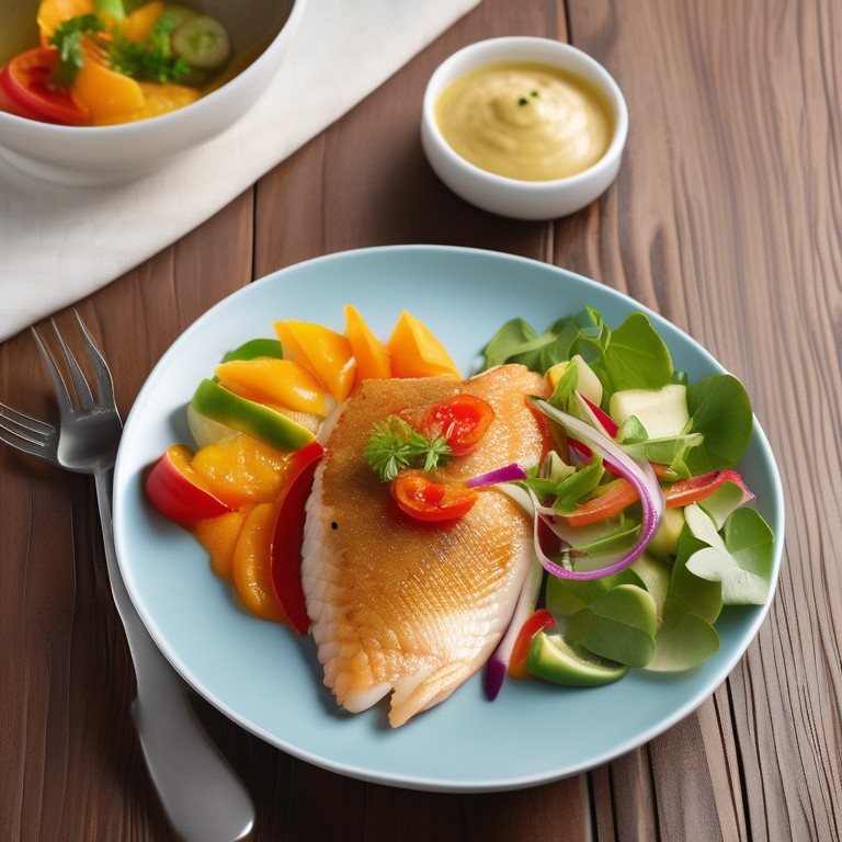 Delicioso filete de tilapia con una salsa tropical de naranjilla y una fresca ensalada de vegetales como acompañante. Una combinación exquisita y saludable.