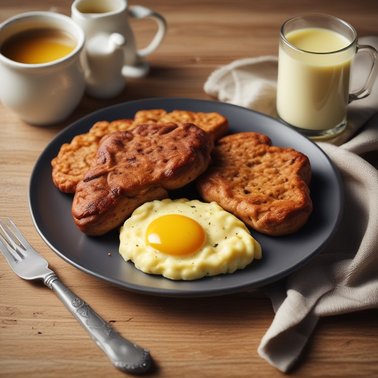 A hearty and delicious breakfast recipe featuring savory sausage links, fluffy scrambled eggs, and flaky biscuits, all served with a touch of butter and a splash of milk. Perfect for a weekend brunch or a quick and satisfying morning meal!