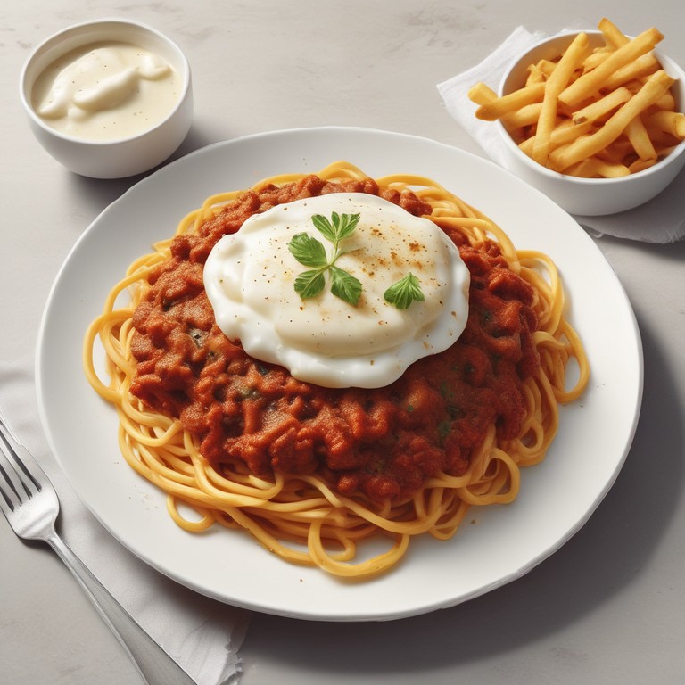 Un plat classique italien avec une touche française. Ce plat combine des spaghetti à la bolognaise, servis avec des frites croustillantes et garnis de mozzarella fondue.