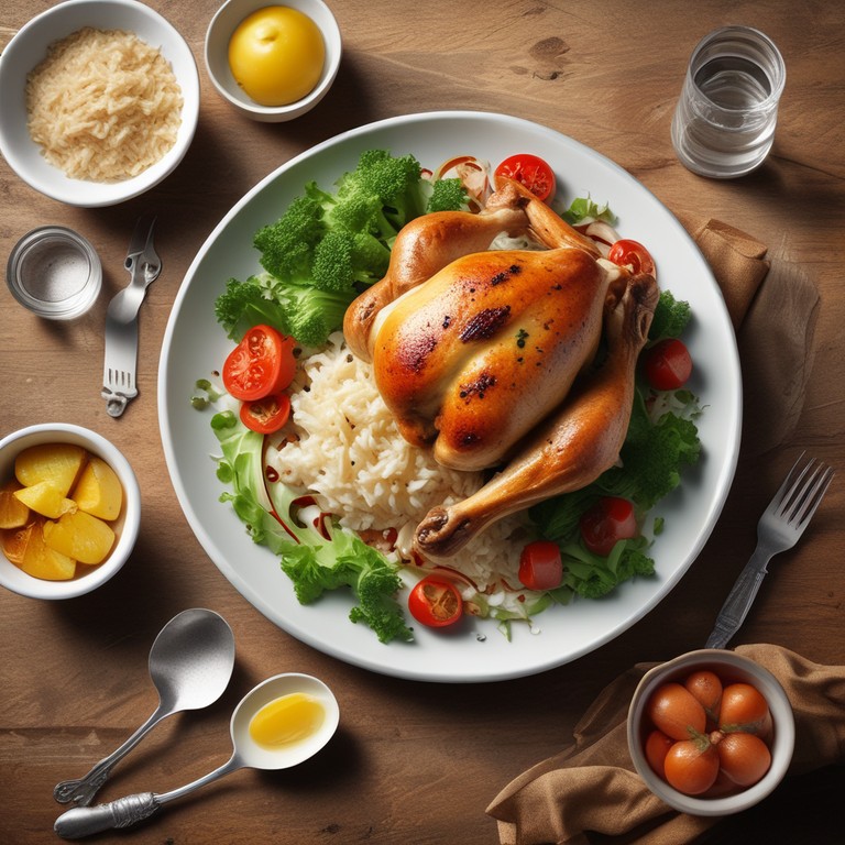 Deliciosa receta de pollo con arroz, acompañado de ensalada fresca y papas al horno. Una comida equilibrada y sabrosa para toda la familia.