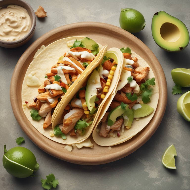 Deliciosos tacos de pollo marinado con una salsa cremosa de aguacate, envueltos en tortillas de maíz caliente.