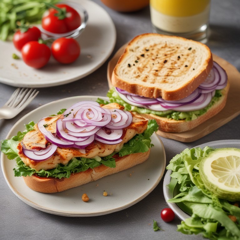 Delicioso sándwich saludable con pechuga de pollo a la parrilla, hummus casero de garbanzos, tomate, cebolla roja, lechuga romana, pepino y un toque de ajo y limón. Perfecto para una comida ligera y sabrosa.