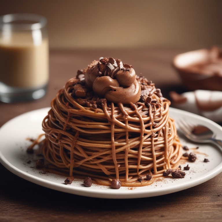 Delicioso postre de espaguetis con una cremosa salsa de Nutella y espolvoreados con chocolate en polvo. Un postre único y fácil de preparar que satisfará tu antojo de dulce.