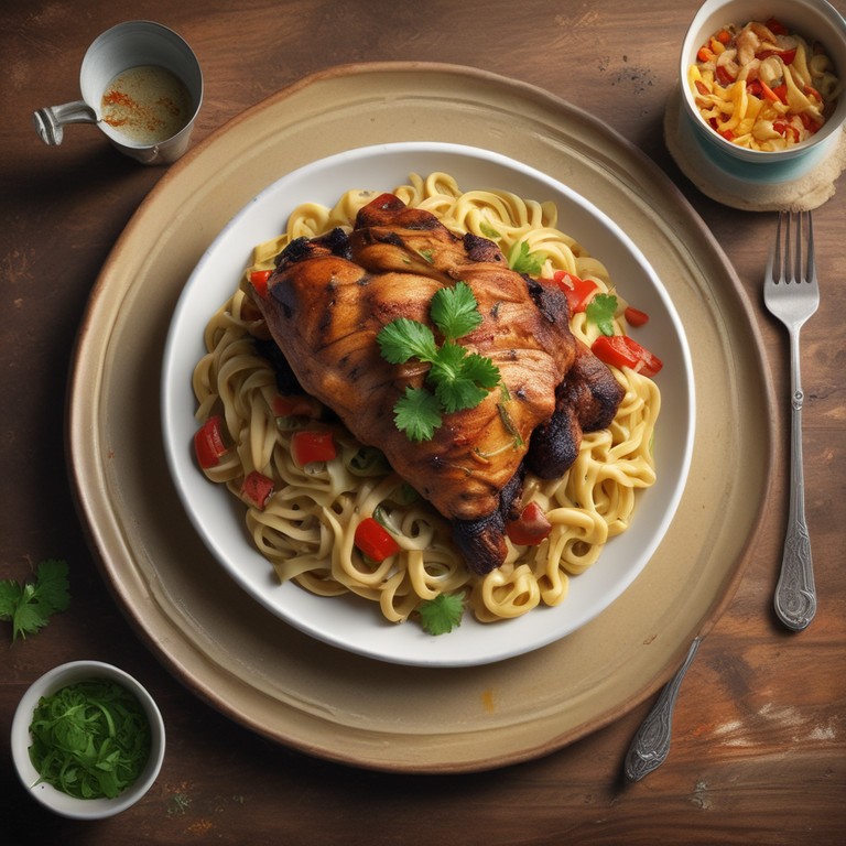 A fusion of spicy Jamaican jerk chicken served with creamy Rasta pasta, a colorful and flavorful dish that will tantalize your taste buds!