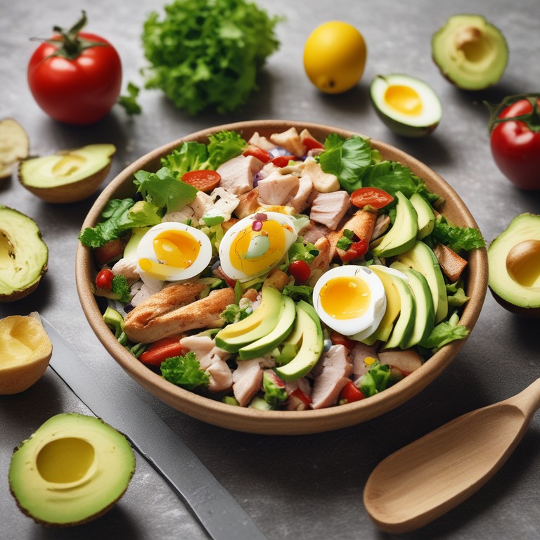 Una deliciosa ensalada con huevo, pechuga de pollo, lechuga y aguacate, perfecta para una comida saludable y satisfactoria.