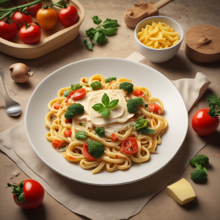 Deliciosos fideos con una cremosa salsa de queso y verduras frescas