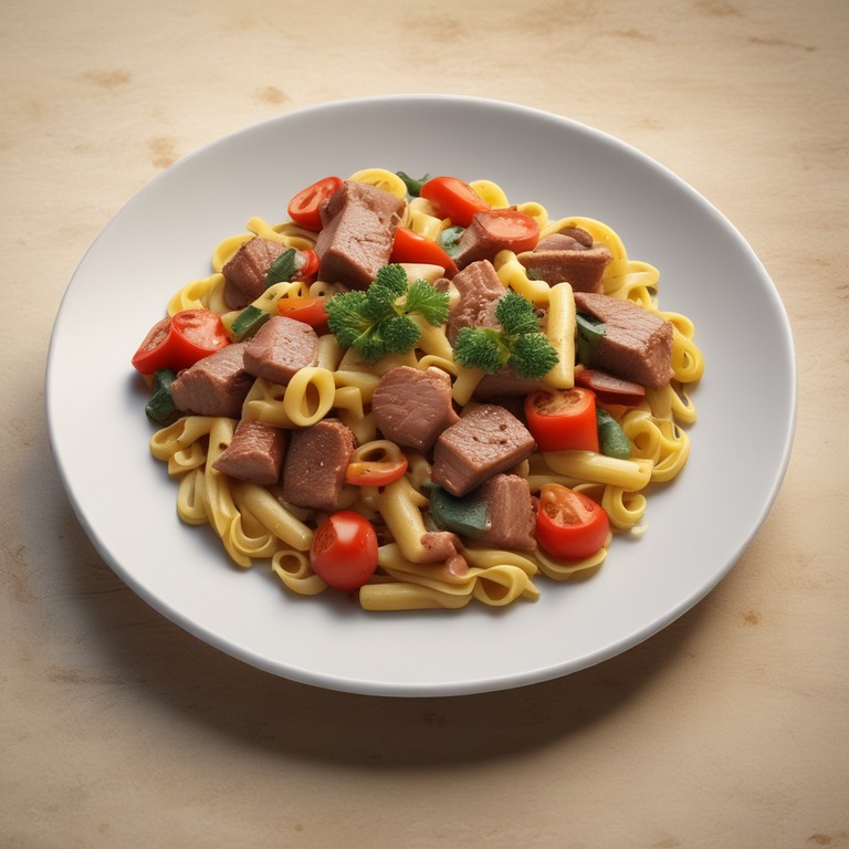 Un plato delicioso y reconfortante que combina carne tierna, pasta al dente y verduras frescas salteadas en una mezcla de sabores perfectamente equilibrados.