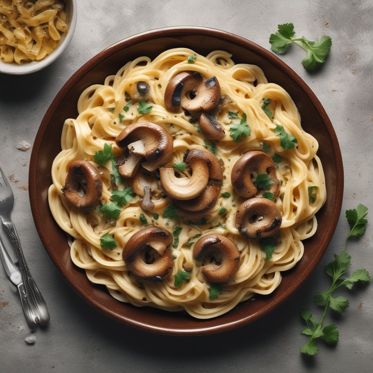 Una deliciosa receta de pasta con champiñones en una salsa cremosa de ajo y cilantro, complementada con cebolla caramelizada.