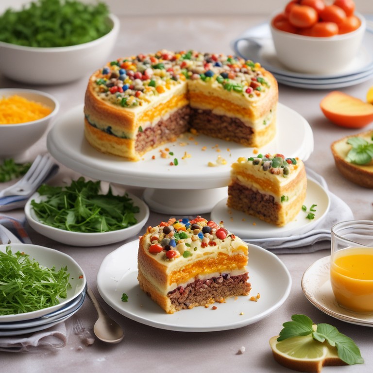 Una deliciosa y colorida torta salada perfecta para celebrar cumpleaños. Esta receta lleva capas de sabrosa carne, vegetales frescos y queso fundido. ¡Una comida festiva e irresistible!