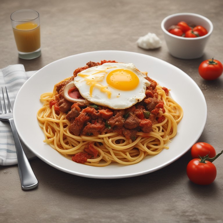 Deliciosa receta de espaguetis a la boloñesa con carne de cerdo, tomate, cebolla, pimiento y huevo frito.