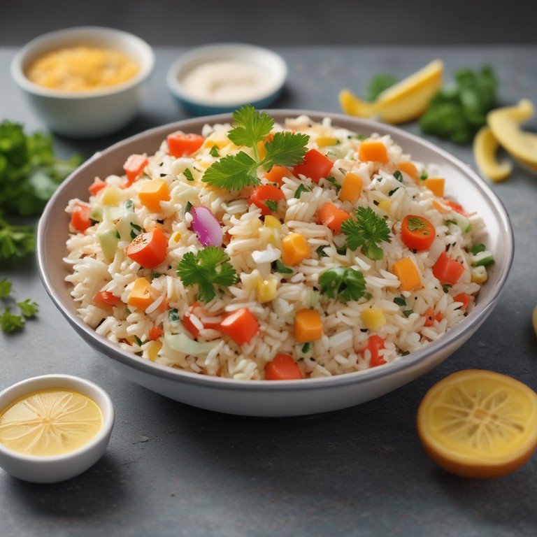 Una ensalada refrescante y colorida con arroz, zanahoria, lechuga, tomate, papas, limón, cilantro, plátano y queso crema.