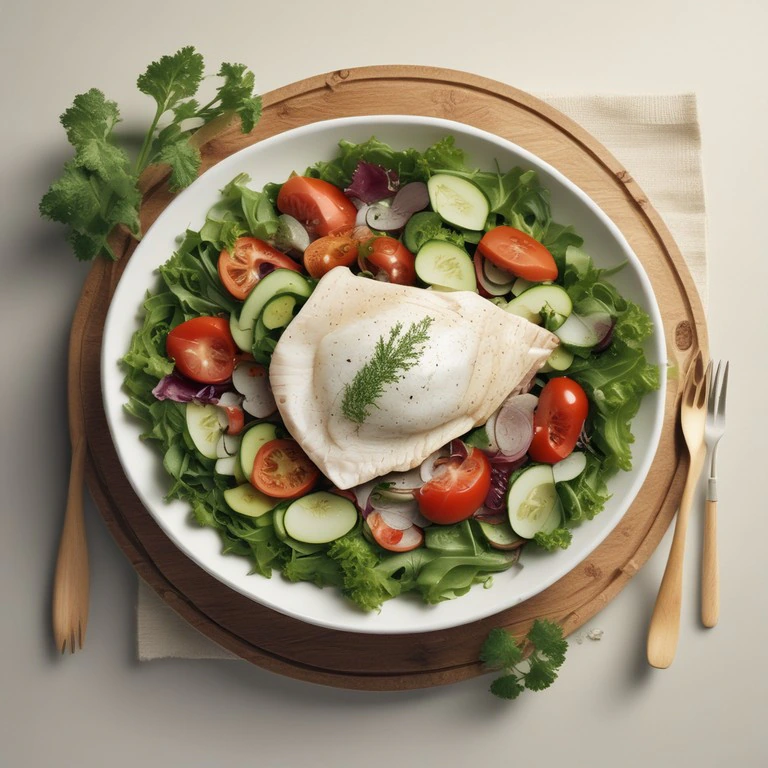 Una deliciosa ensalada fresca y saludable que combina pescado blanco cocido con una variedad de vegetales y frutas. Perfecta para una comida ligera y nutritiva.