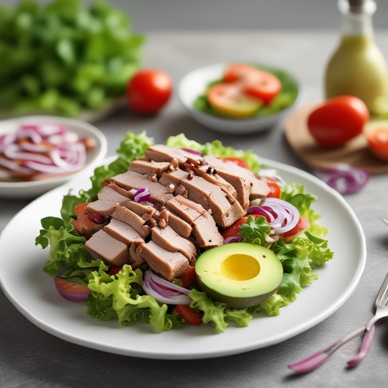 Una deliciosa y saludable ensalada de cerdo que combina la jugosidad de la carne de cerdo con la frescura de la lechuga, los tomates, la cebolla roja y el aguacate. Esta ensalada es fácil de preparar y es perfecta para una comida ligera y nutritiva.