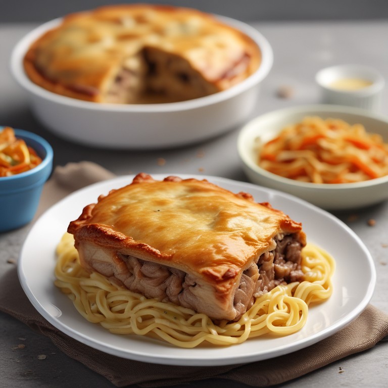 Este pastel de pollo y carne con fideos es una deliciosa combinación de sabores. Las capas de pollo desmenuzado, carne picada, verduras y fideos se hornean juntas para crear un plato reconfortante y sabroso. Perfecto para una comida familiar o una cena especial.