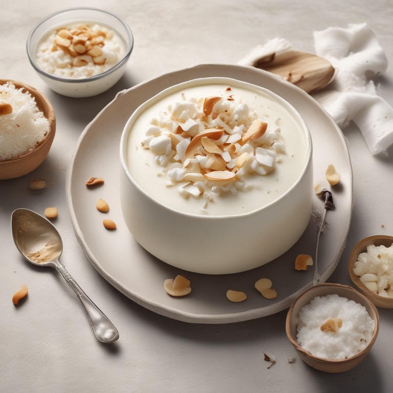 Este postre sin leche es una deliciosa opción para aquellos que prefieren evitar los lácteos. Con una textura cremosa y un sabor a coco y vainilla, este postre frío es perfecto para cualquier ocasión. La adición de coco rallado y almendras fileteadas le da un toque crujiente y sabroso. ¡Disfruta de este postre refrescante y delicioso!