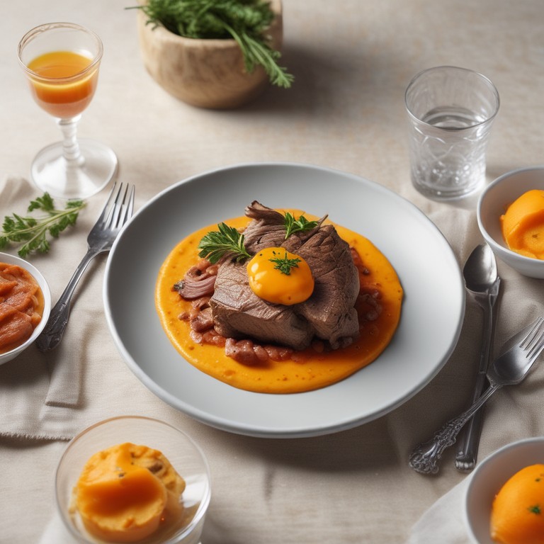 Borrego Asado con Puré de Zanahoria y Salsa de Naranja