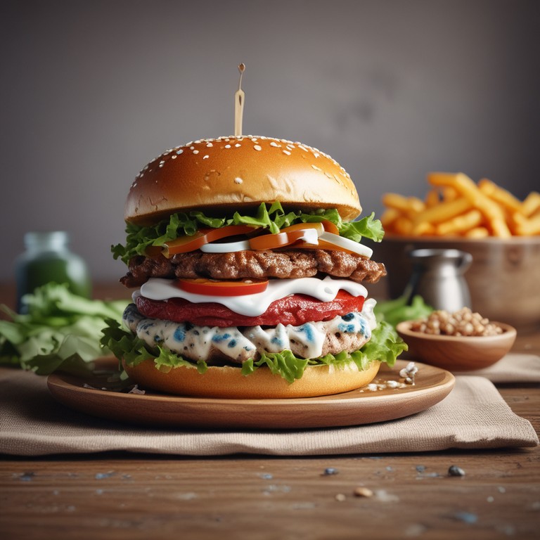 Una hamburguesa gourmet con un toque especial. La combinación de la mayonesa de queso azul y la cebolla caramelizada eleva el sabor de esta hamburguesa a otro nivel. Perfecta para sorprender a tus invitados o disfrutar en una cena especial en casa.