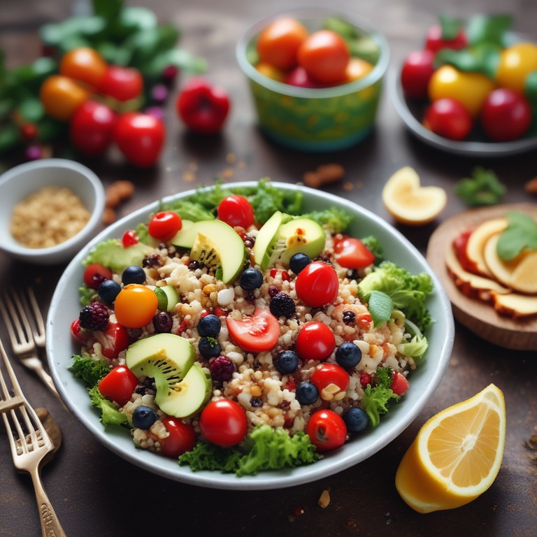 Esta ensalada de frutas y verduras es una opción deliciosa y saludable que cumple con los requisitos nutricionales especificados. Con una combinación equilibrada de hidratos de carbono, proteínas, y lípidos, además de ser rica en fibra y vitamina C, esta ensalada es perfecta para una comida ligera y nutritiva. ¡Prepárala y disfruta de una explosión de sabores frescos y coloridos!