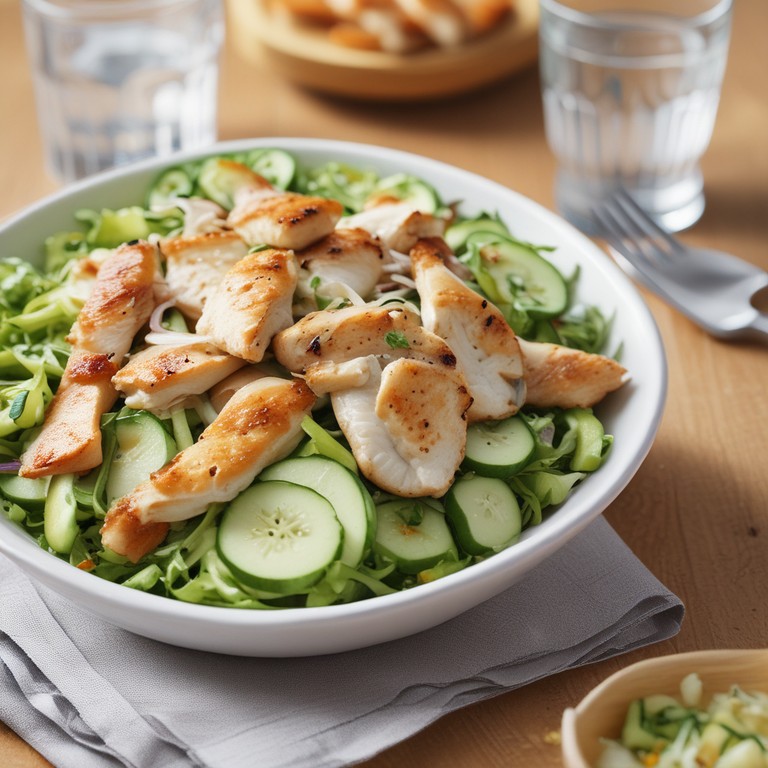 Una ensalada fresca y saludable que combina la jugosidad del pollo con la frescura del pepino y la cebolla. Perfecta como plato principal o acompañamiento en cualquier comida.