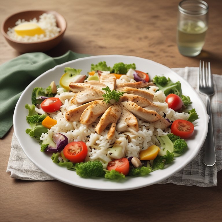 Una ensalada fresca y saludable que combina pollo a la parrilla, verduras variadas, arroz y una base de lechuga. Perfecta para una comida ligera y nutritiva.