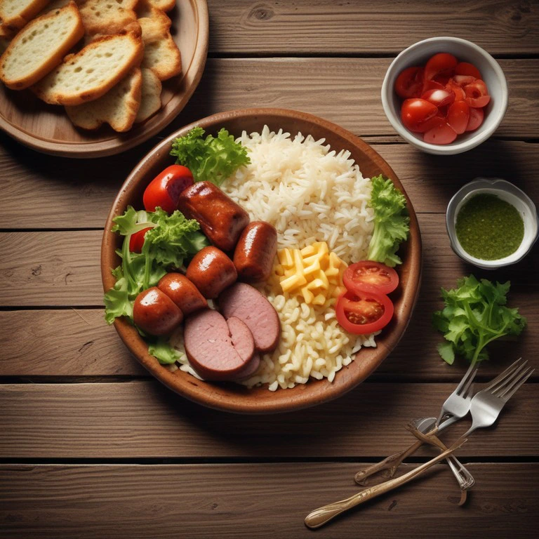 Este plato combina la sencillez del arroz con la sabrosura de las salchichas, acompañado de una ensalada fresca que aporta un toque crujiente y saludable. Ideal para una comida rápida y deliciosa.