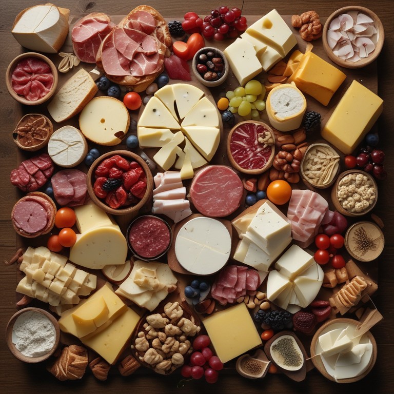 Esta tabla de quesos y embutidos gourmet es perfecta para compartir en reuniones y celebraciones. Con una variedad de quesos y embutidos, acompañados de frutos secos y frutas frescas, es un festín visual y gustativo que encantará a tus invitados.