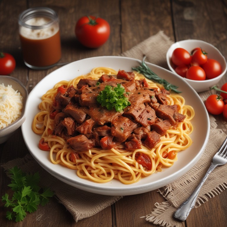 Un delicioso plato que combina la suavidad de la carne de cerdo con el sabor ahumado de la salsa barbacoa, acompañado de espaguetis y arroz, ideal para una comida reconfortante.