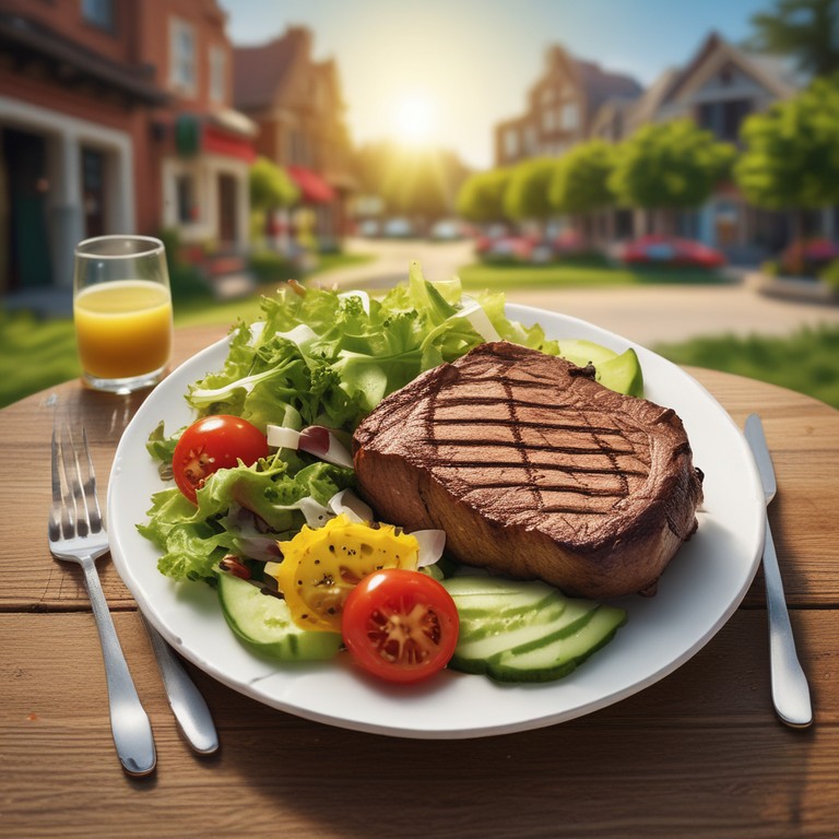Un delicioso bistec de res a la parrilla acompañado de una ensalada fresca y colorida, ideal para una comida ligera y nutritiva.