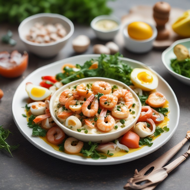 Una deliciosa receta de camarones en una cremosa salsa de mariscos, acompañados de huevos y cebolla, perfecta para una comida especial.