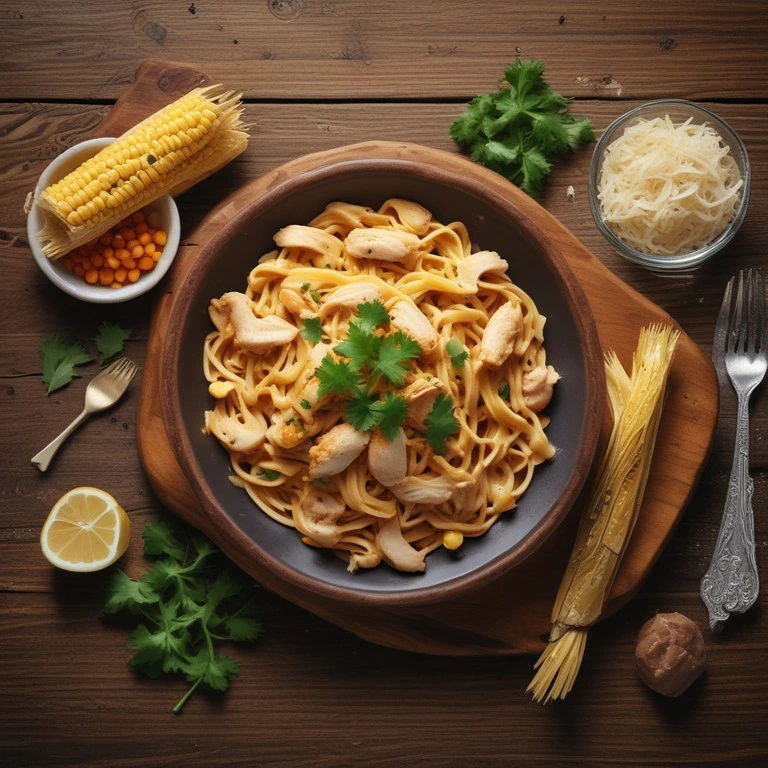 Una deliciosa combinación de pasta con pollo desmenuzado y tortitas de maíz, perfecta para una comida reconfortante.