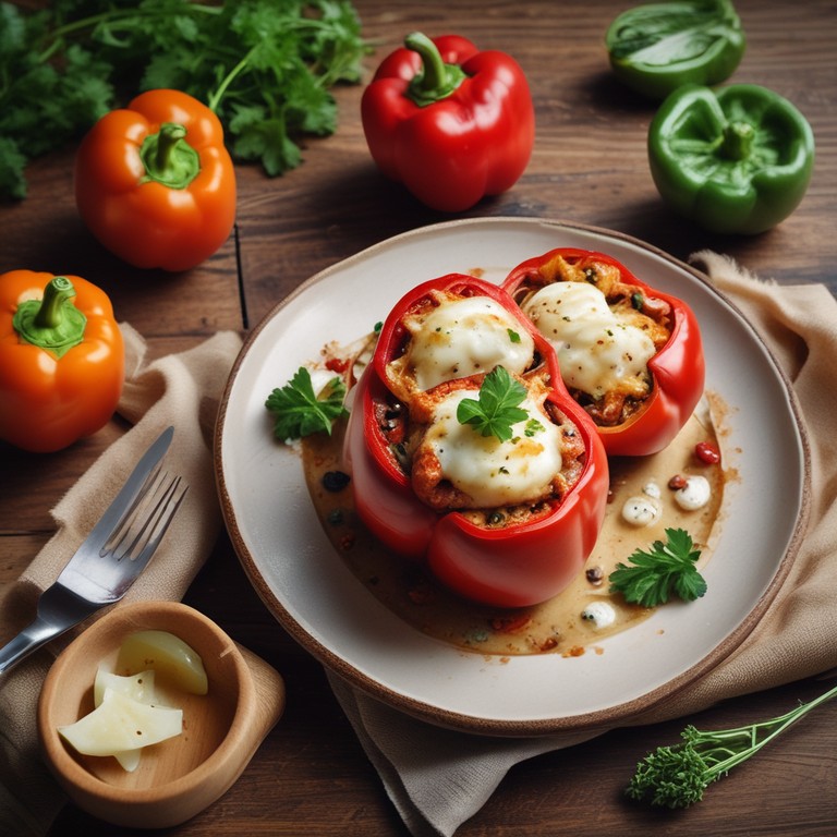 Deliciosos pimientos rellenos de queso mozzarella y verduras, perfectos como plato principal o acompañamiento.
