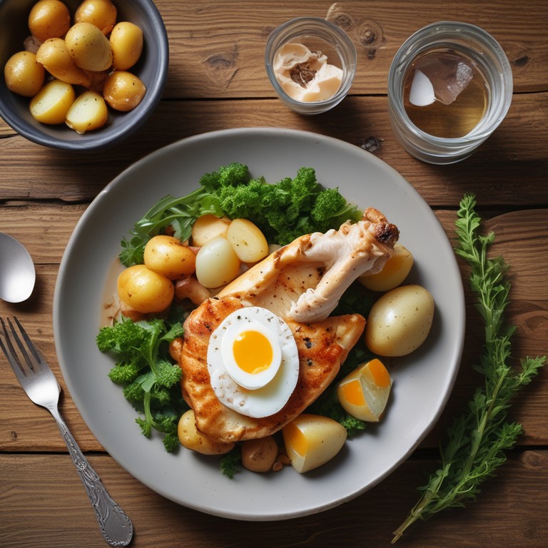 Una receta fácil y rápida para disfrutar de una deliciosa pechuga de pollo acompañada de patatas y huevos, perfecta para una comida nutritiva y sabrosa en poco tiempo.