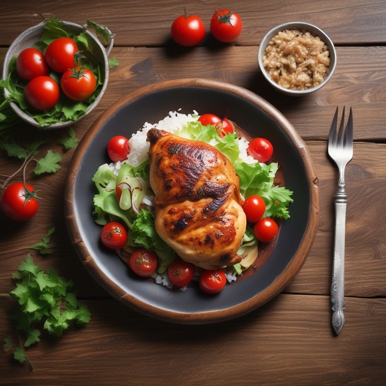 Un delicioso plato que combina pollo a la parrilla, arroz esponjoso y una ensalada fresca, ideal para una comida familiar.