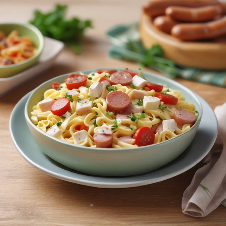 Una deliciosa ensalada de pasta fría, perfecta para días calurosos o como acompañamiento en una reunión. Combina la suavidad de la pasta con el sabor de las salchichas y la cremosidad de la mayonesa.