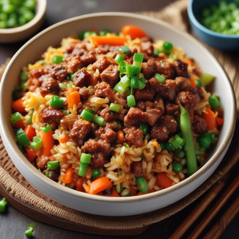 Un delicioso y colorido arroz frito con carne molida, bañado en salsa teriyaki, perfecto para una comida rápida y sabrosa.