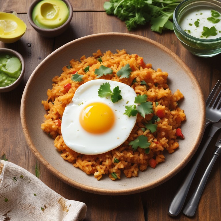Un delicioso y colorido plato de arroz a la mexicana, perfecto para un desayuno o almuerzo, acompañado de huevos y decorado con cilantro fresco.