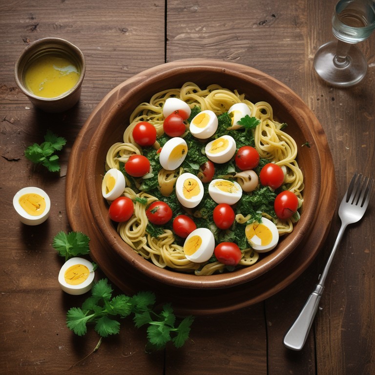 Una deliciosa receta de pasta al pesto, acompañada de tomates frescos y huevos duros, perfecta para una comida rápida y sabrosa.