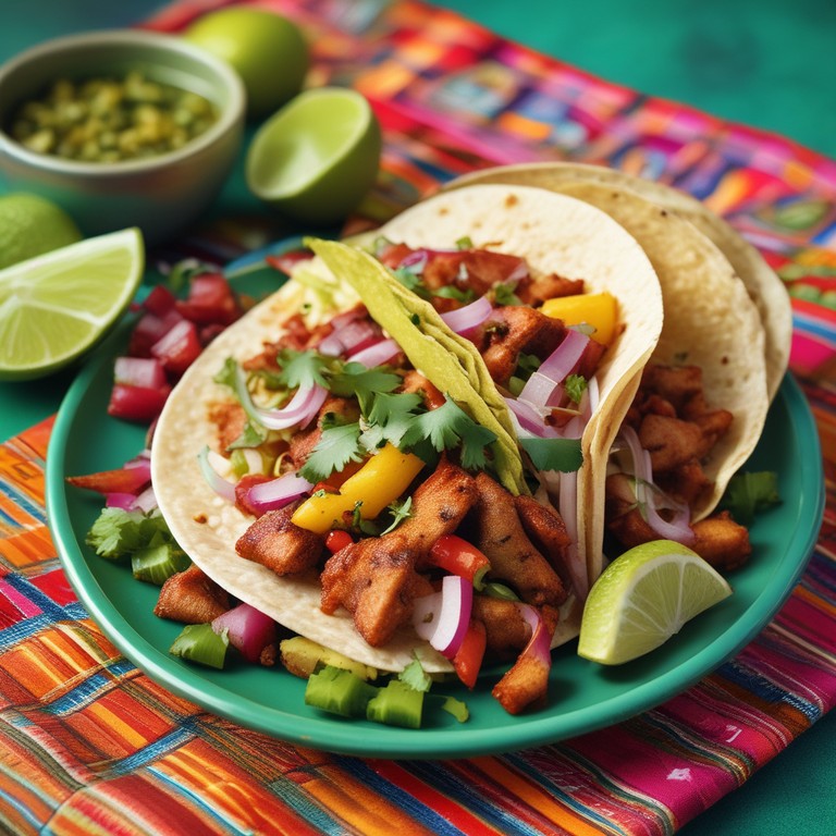 Deliciosos tacos al pastor, marinados en una mezcla de chiles y especias, acompañados de piña asada y salsa verde, perfectos para una comida mexicana auténtica.