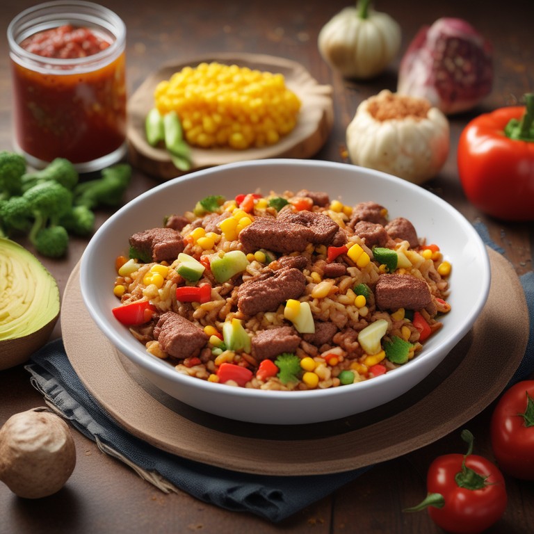 Un delicioso y nutritivo plato que combina carne molida con arroz y una variedad de verduras, ideal para una comida completa y satisfactoria.